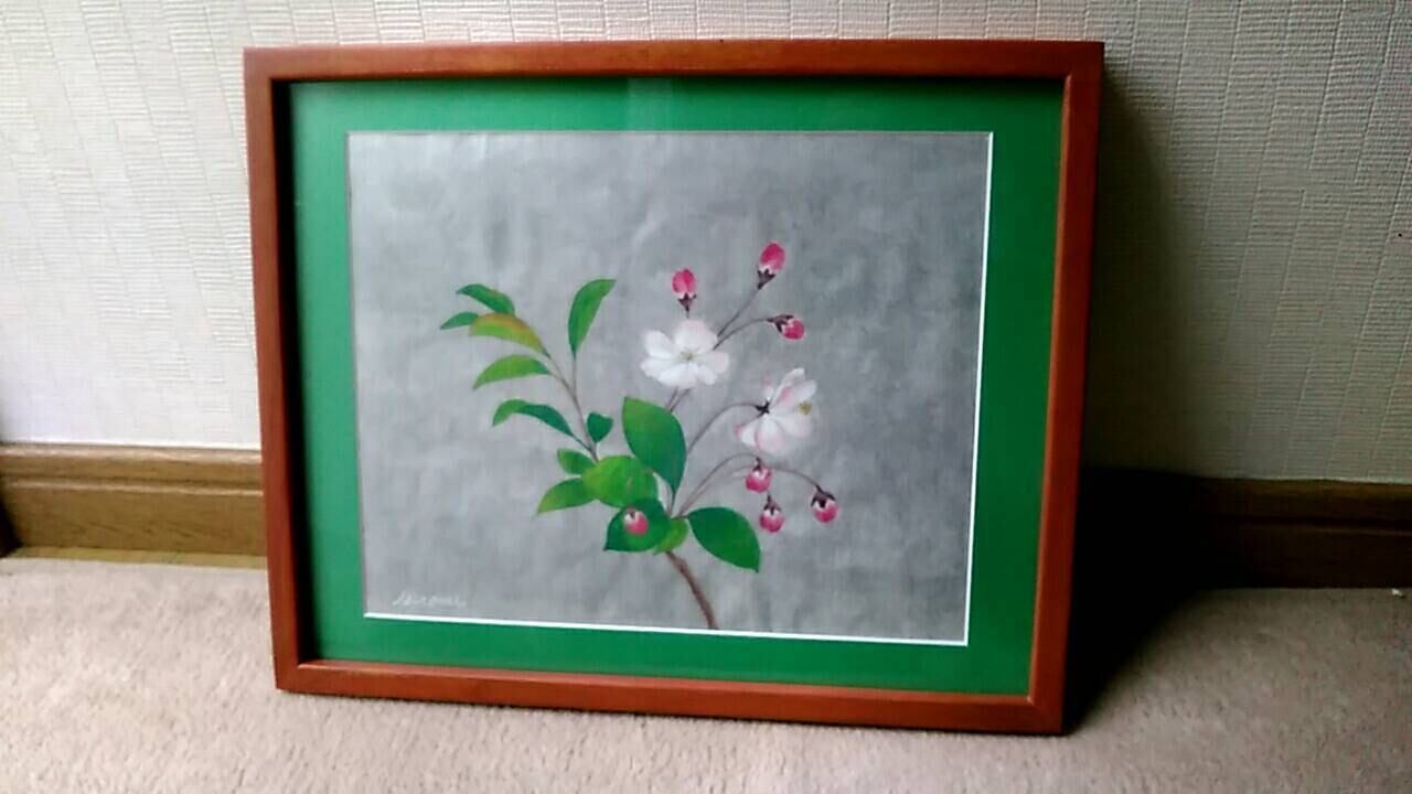 かいどう桜 サイズ:26cm×32cm 色の濃い赤いつぼみが、幻想的な白に輝いて開花