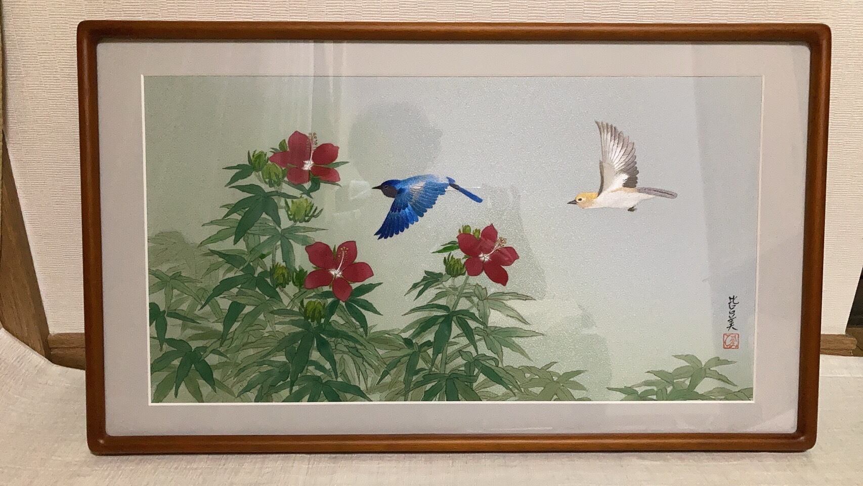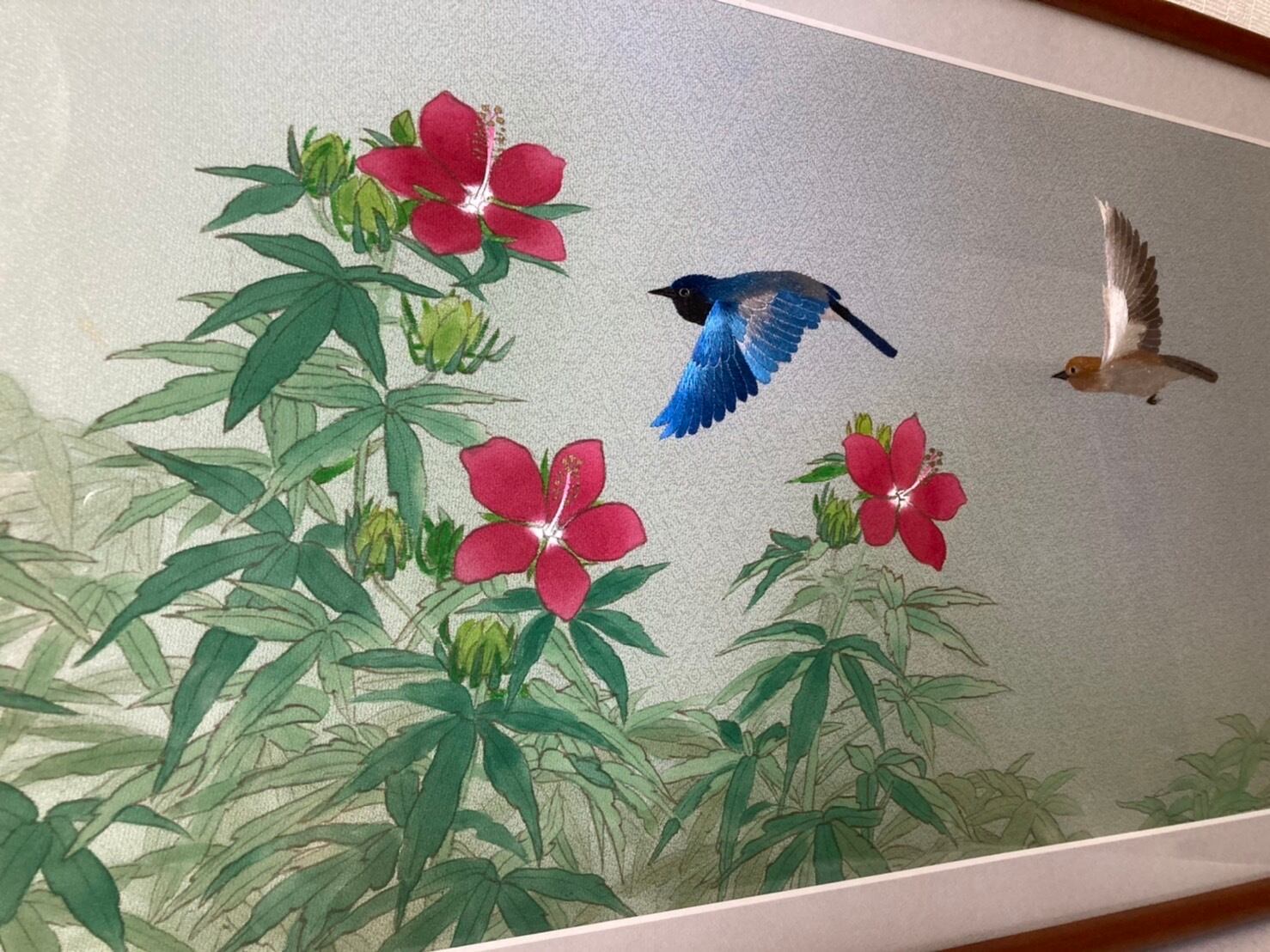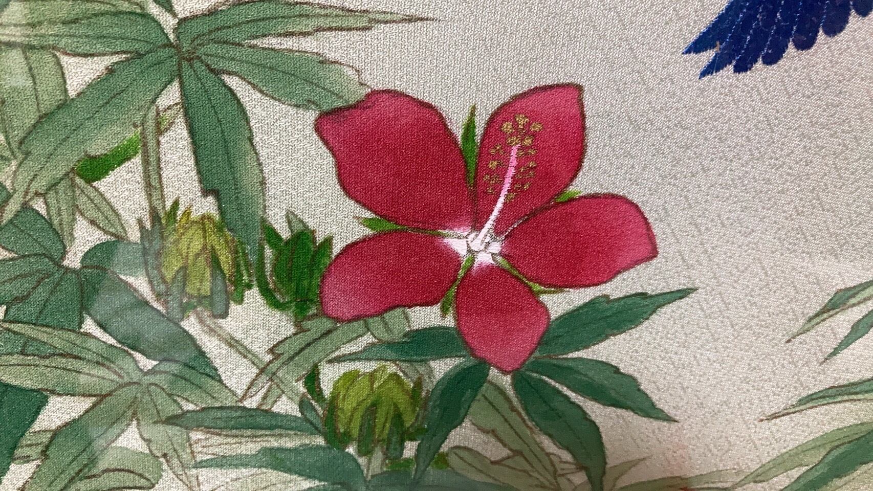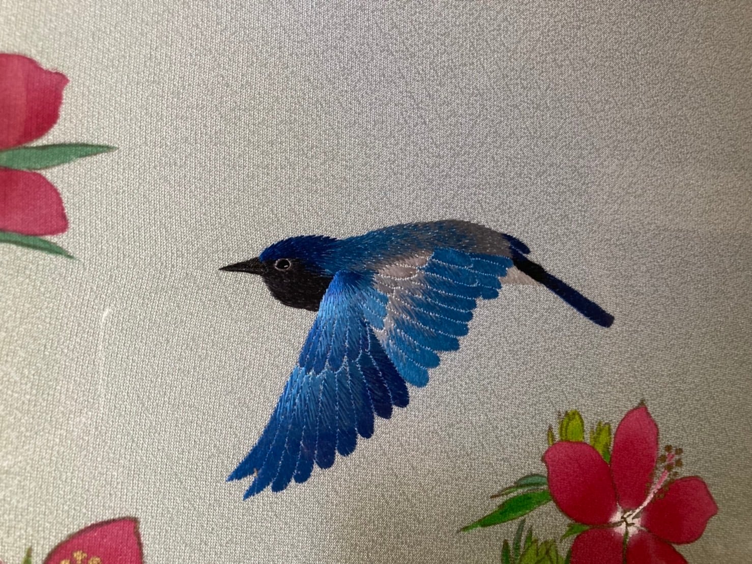 京刺繍のルリビタキのつがいを、派手な赤いコウショッキの花と合わせています。