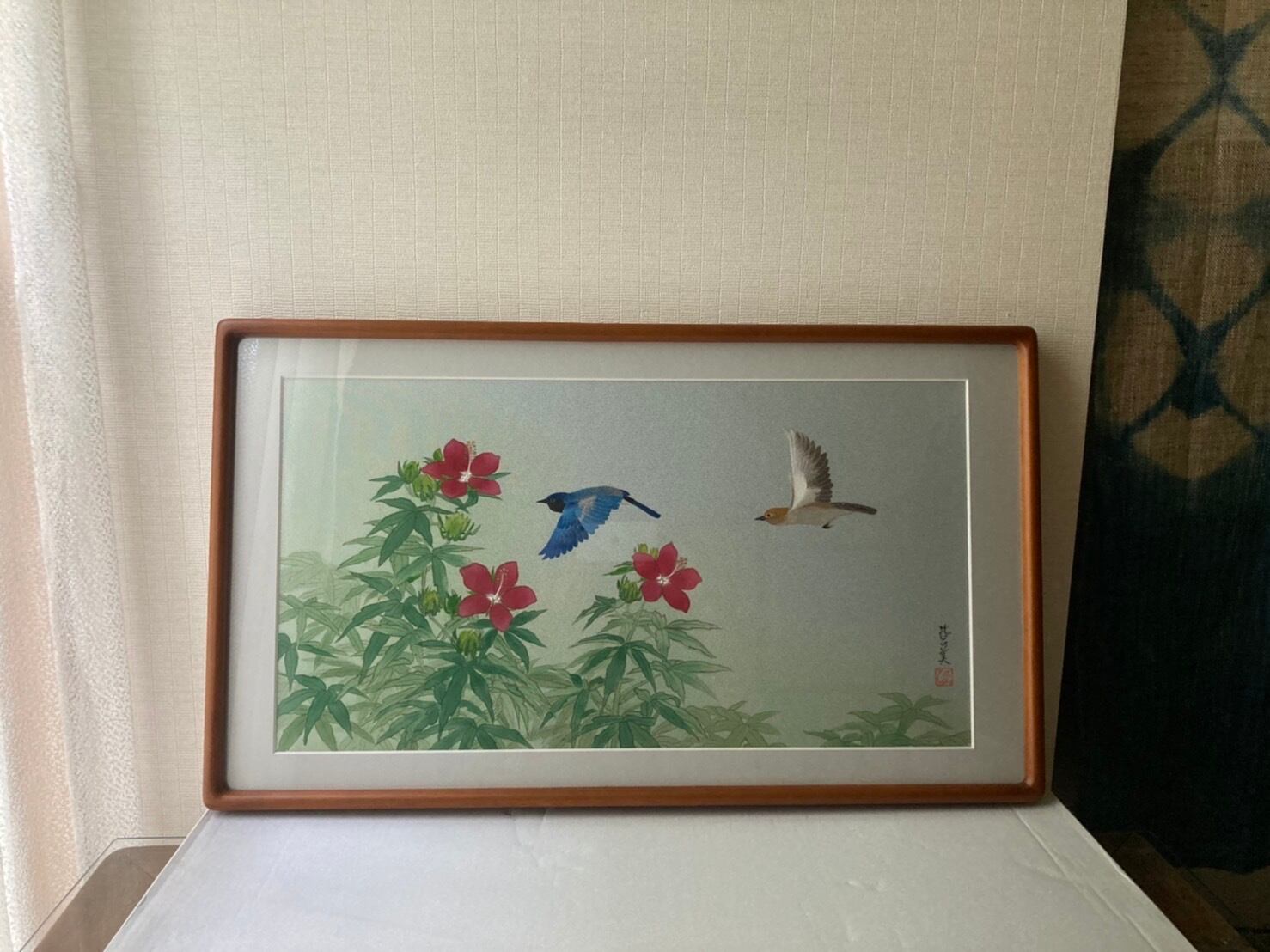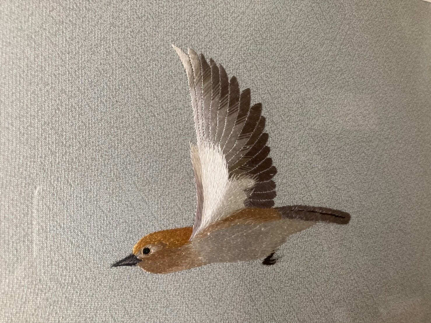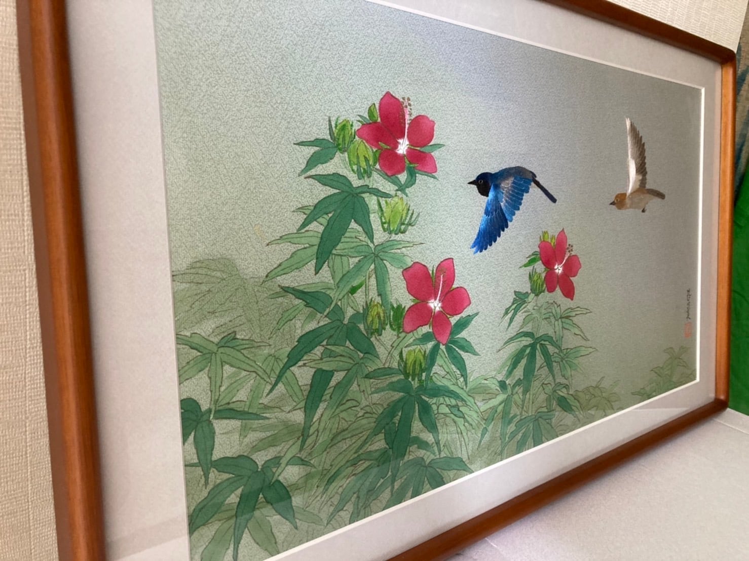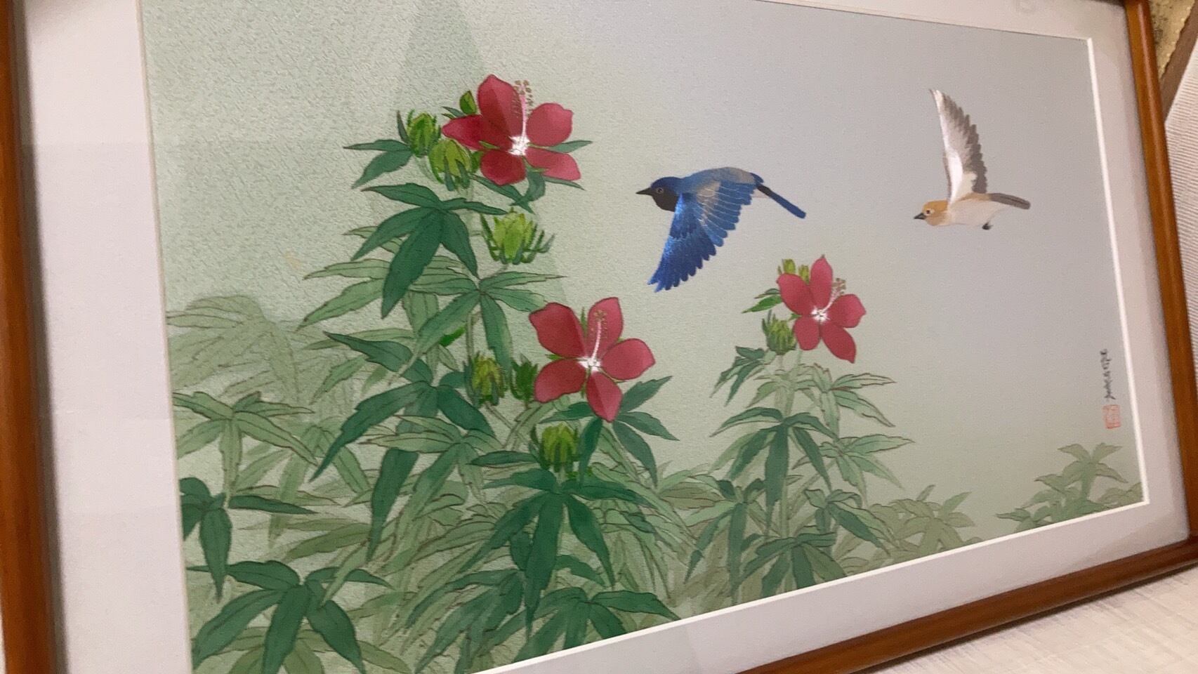 京刺繍のルリビタキのつがいを、派手な赤いコウショッキの花と合わせています。